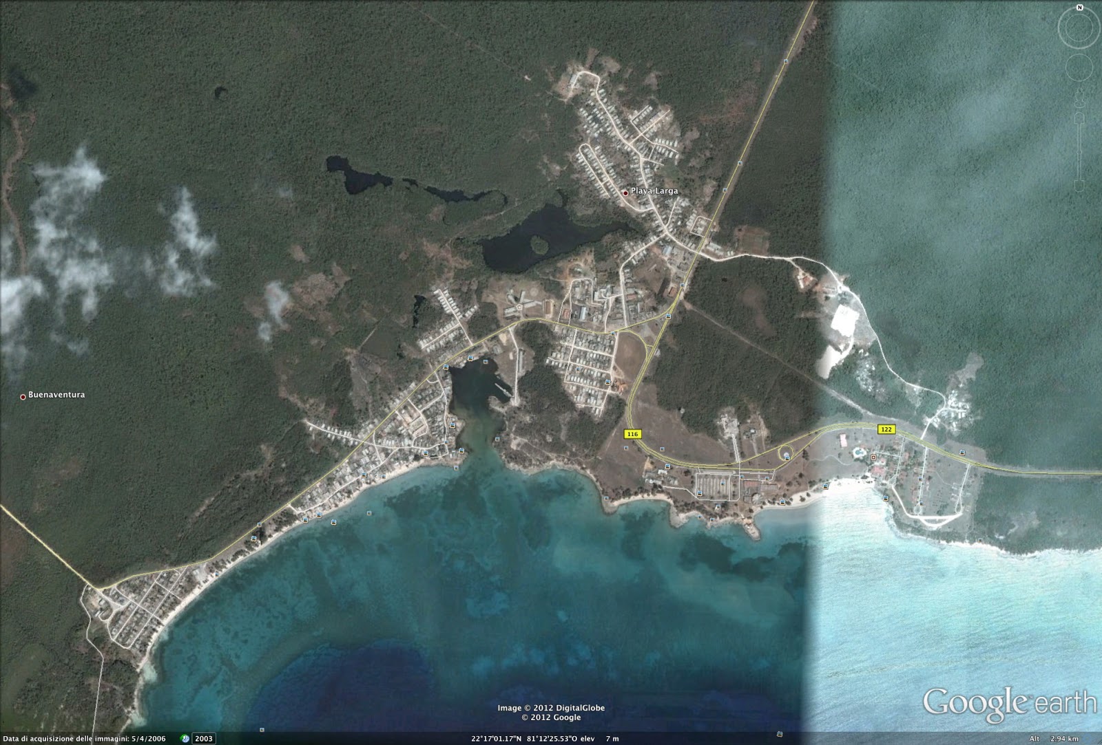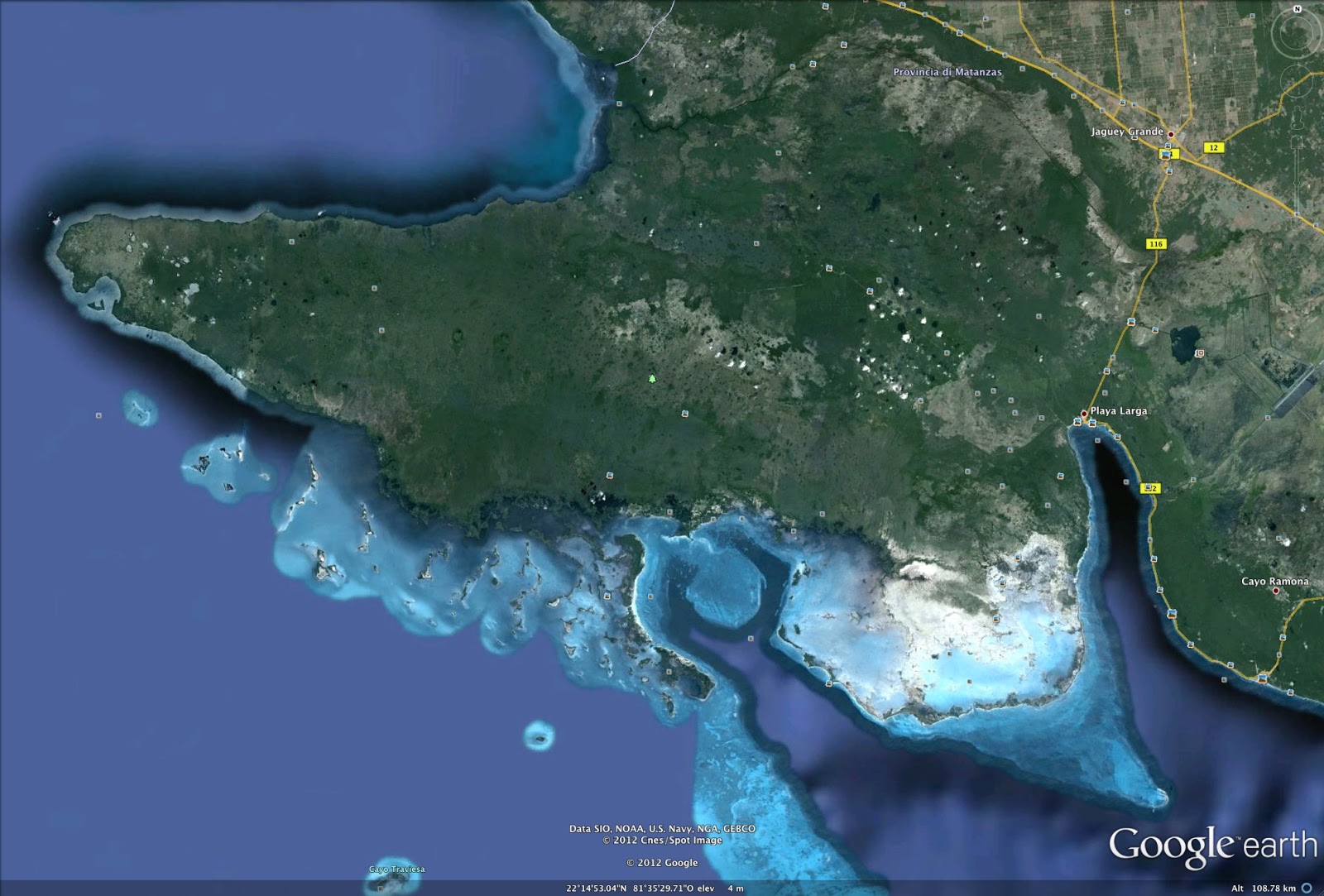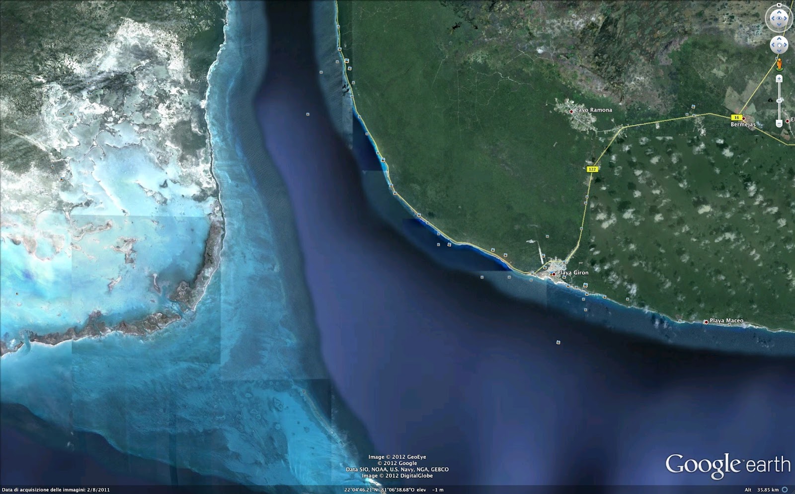 imbarcarsi per raggiungere le spettacolari grotte della Bahía de Cochinos; Colors of the Reef (http://www.reefcolors.de/HTML_Info/PlayaLarga_Info.html) si dice pienamente soddisfatto partendo per le escursioni da Playa Larga. Riesaminado le foto satellitari (a sinistra l’intera Baia dei Porci con l’area naturalistica protetta che delimita il lato ovest della baia, al centro l’abitato di Playa Larga in fondo alla baia, a destra l’imbocco della baia con Playa Giron sulla sinistra), in effetti la questione non chiara, ma 30 km con un taxi rendono le due località intercomunicanti.