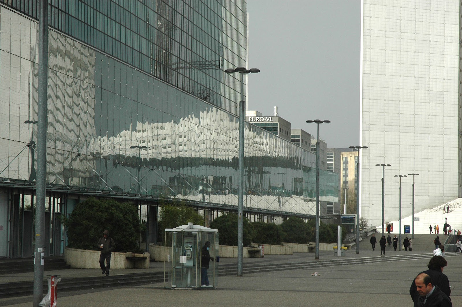 Barcelona, reflected images under the overhang of Miralles