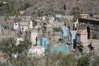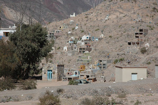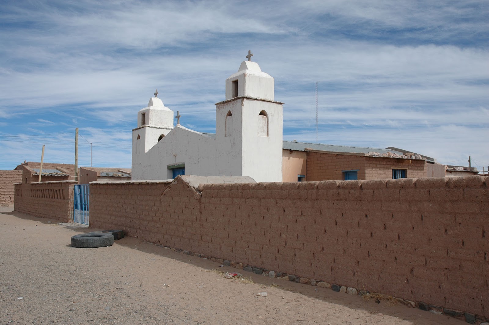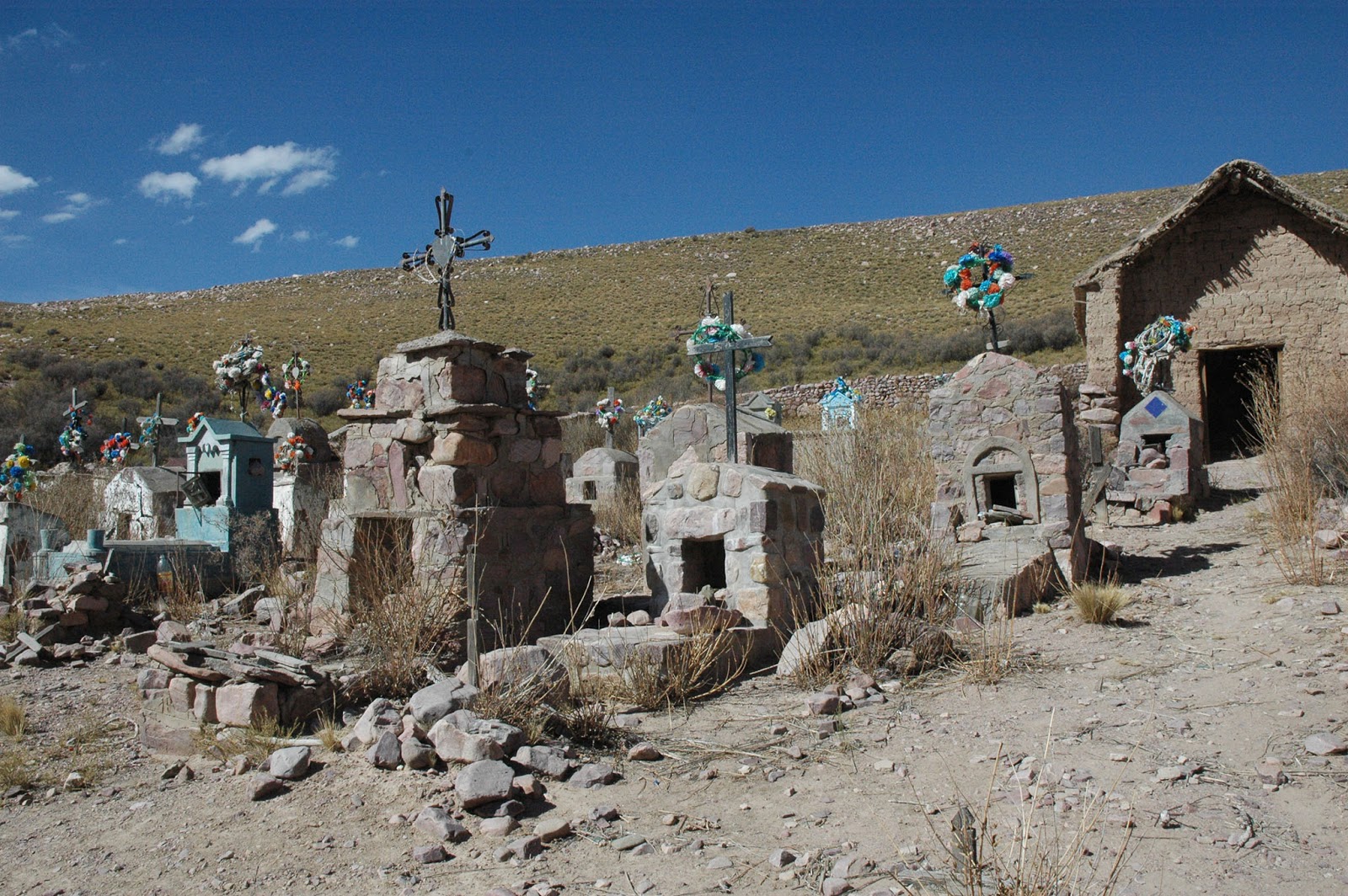 Il contatto tra culture diverse genera risultati con un sapore particolare. I cimiteri (dei pueblos de Juella, Iturba e Maimará nella quebrada de Humahuaca) e le piccole chiese che ho incontrato sulla puna jujeña (provincia di San Salvador de Jujuy nel nord dell’Argentina al confine con la Bolivia) sono quasi uguali ai loro modelli di derivazione europea, spagnola in particolare. Eppure c’è qualcosa di diverso, soprattutto nelle tombe. La relazione con la terra del piccolo tabernacolo è praticamente assente nei nostri cimiteri che tendono a mantenere un carattere urbano, costruito. Poi la presenza di questo colore azzurro turchese che lega la terra al cielo. Il tutto fuso con i spazi grandi, infiniti, dove l’occhio non trova punti di ancoraggio. Le chiese ( dei pueblos de Iturba, Purmamarca, Juella e del Santuario de Tres Pozos) cercano di essere un momento di sosta, ma non per questo diventano antagoniste con la natura selvaggia che le circonda.